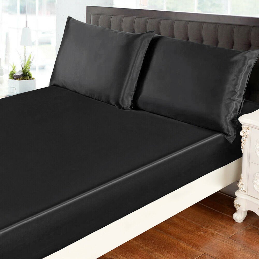 Soft Silky Satin Bed Sheet Set Pillowcase Solid Deep Pocket Flat Fitted Sheet