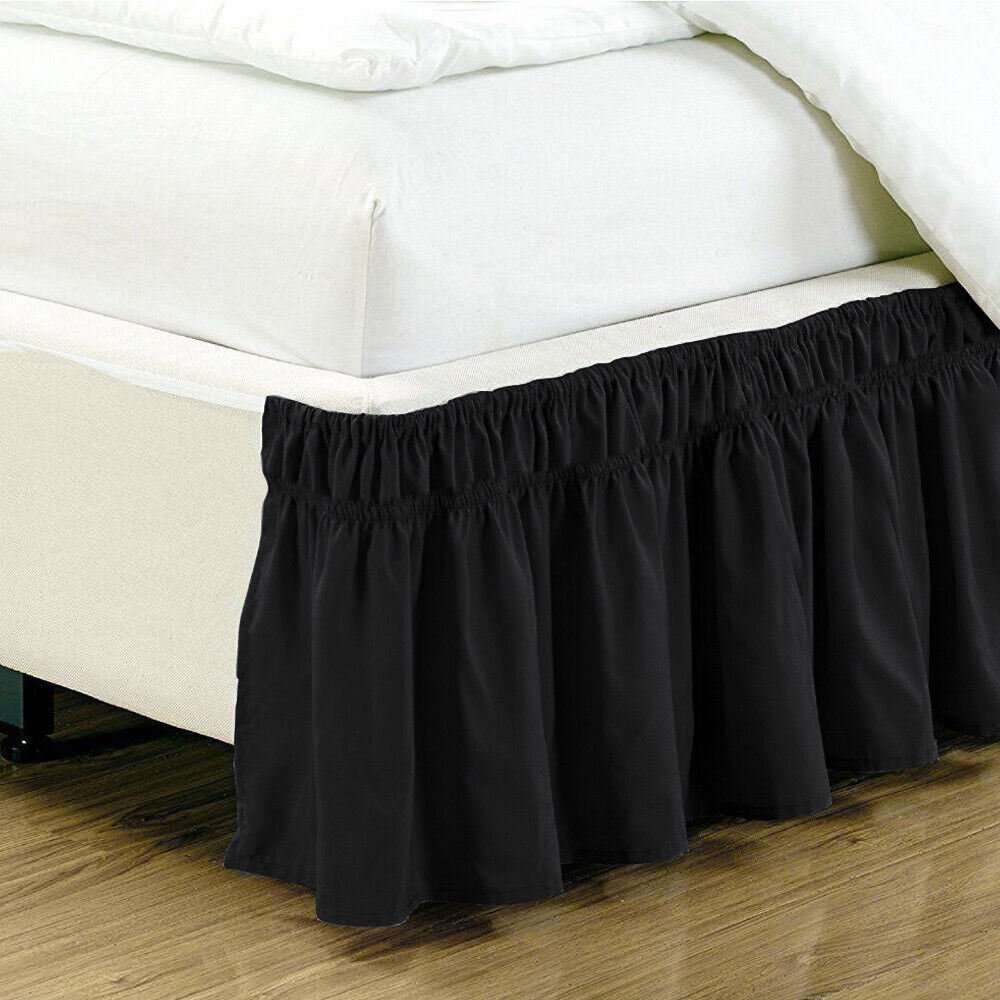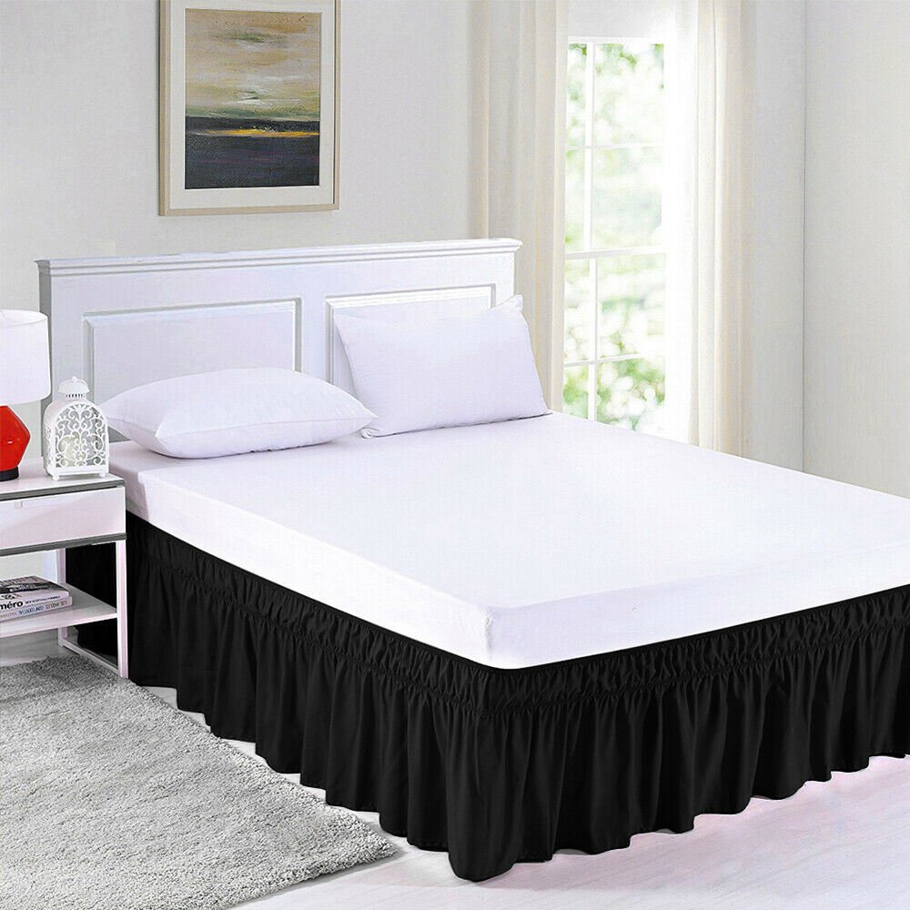 Here is our QueenKing size elastic bed wrap ruffle bed skirt, which will be a great decoration to any style of bedding in your bedroom. The elastic trimmed ruffle makes it easy to put on and take off your bed, you won't even need to lift the mattress.